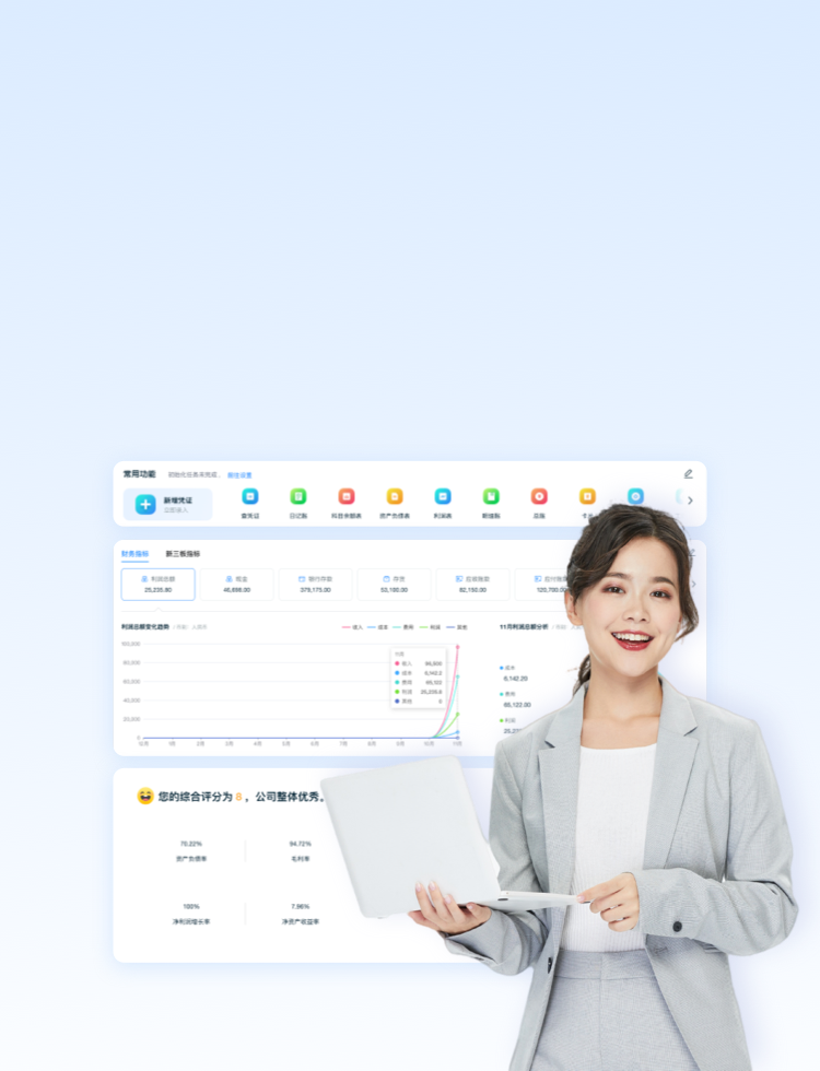 智能记账轻松上手,资金管控权责分明财税一体省时省力,电脑手机多端协同